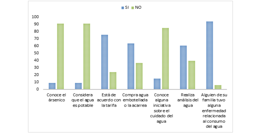 Para esto último se elaboró un diseño muestral que contempló población del municipio Nueve de Julio que estuviera conectada al servicio por red. El instrumento que se diseñó combinó preguntas cerradas como las siguientes: si el entrevistado tenía agua de red, agua dentro o fuera de su vivienda o fuera de su terreno, así como tanque de almacenamiento de agua en su vivienda; si realizaba tareas de mantenimiento al mismo; si había escuchado hablar sobre la contaminación del agua y sobre el arsénico en su municipio, y si había efectuado análisis bacteriológicos o químicos al agua. Asimismo se formularon preguntas abiertas, tales como: si consideraba que el agua que llegaba a su vivienda era potable y por qué; si conocía alguna iniciativa que se estuviera implementando en su municipio para mejorar o expandir el servicio de agua, y en este caso cuál sería; si estaba de acuerdo con lo que pagaba por la tarifa de agua y por qué; si compraba agua embotellada y por qué; si acarreaba agua y, por último, si alguien en su familia había padecido alguna enfermedad relacionada con la calidad del agua, cuál había sido esa enfermedad y cuánto tiempo hacía del suceso.