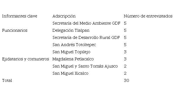 Los grupos focales se utilizaron para desarrollar el cuestionario detallado, y la discusión se centró en torno a las siguientes preguntas: 1) ¿Cuáles son los diferentes relatos sobre el SC en la Ciudad de México?, y 2) ¿Cómo se visualizan los problemas y las consecuencias en las narrativas sobre el SC y el desarrollo de políticas en la periferia (borde) urbana? Se realizaron también entrevistas semiestructuradas con aquellos interesados que accedieron a participar, de los cuales quince eran comuneros y otros quince eran funcionarios de la Secretaría del Medio Ambiente del Distrito Federal, de la Secretaría de Desarrollo Rural del Distrito Federal y de la delegación Tlalpan (Cuadro 1). Así, las entrevistas consistieron en una serie de preguntas abiertas, así como preguntas detalladas, en las que se quiso indagar acerca de las percepciones sobre las políticas de conservación y desarrollo rural, con relación a la efectividad para contrarrestar la expansión urbana.