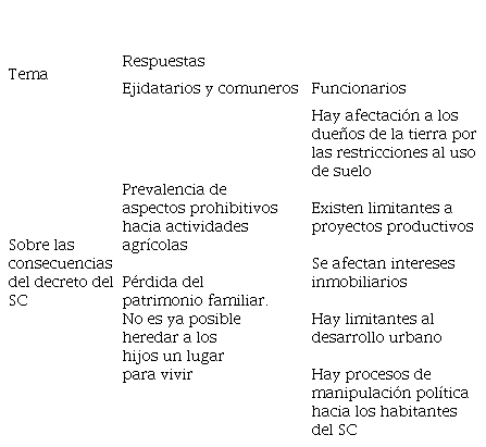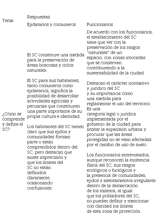 Para todos los funcionarios, el SC es una categoría legal o jurídica implementada por el gobierno de la Ciudad para limitar la expansión urbana y procurar que las áreas protegidas no se vean afectadas por el cambio de uso de suelo, la urbanización, así como preservar dicho territorio en su estado “natural”. Para 80 % de los funcionarios, el SC es un espacio o superficie que da sustentabilidad ambiental a la ciudad, con una clasificación que norma y dictamina una serie de actividades y establece restricciones para el uso urbano. Para todos los comuneros el SC es un territorio para proveer de recursos y para preservar aspectos culturales. Desde su comprensión, el SC es una porción de la ciudad con atributos muy diferentes al resto del espacio urbano y estos rasgos deben mantenerse. Para 87 % de los comuneros y ejidatarios entrevistados, destaca la idea de que el SC constituye una medida para la preservación de áreas boscosas y ciclos naturales.