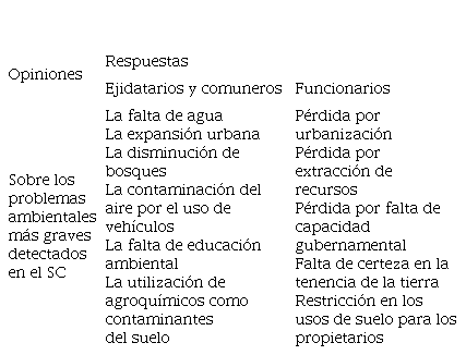 Todos los comuneros y ejidatarios perciben como problema ambiental más grave del SC la falta de agua. Un 90 % de ellos mencionan además que el problema principal es la expansión urbana. Un 66 % de los comuneros y ejidatarios mencionan la disminución de bosques y la contaminación del aire por autos. Más del 50 % de las respuestas mencionan la falta de educación ambiental y la utilización de agroquímicos como contaminantes del suelo.