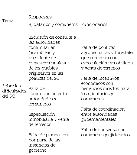 Los funcionarios y comuneros priorizan de forma distinta las políticas, divergiendo igualmente sus percepciones sobre las dificultades asociadas con su ejecución en el SC. Muchos de los funcionarios identifican como problema la falta de políticas agropecuarias y forestales que compitan con la especulación inmobiliaria y la venta de terrenos. En sus respuestas se hace patente su percepción acerca de que los programas de conservación carecen de una visión integral que incorpore estrategias de desarrollo rural. Otro elemento a destacar también en sus respuestas es la mención de la falta de recursos económicos y humanos, así como su visión de que los instrumentos legales están atrasados e incluso, rebasados. En la narrativa de los comuneros, gran parte de las respuestas mencionan programas gubernamentales de conservación mal diseñados y aplicados. También mencionan que hay una falta de personal de gobierno para labores de vigilancia y ejecución de programas gubernamentales. La falta de voluntad política de autoridades gubernamentales e ignorancia de los funcionarios de las necesidades y dinámicas comunitarias y ejidales, se expresa en un 60 % de las respuestas.