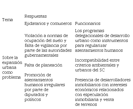 Del grupo de comuneros y ejidatarios, 87 % mencionan que la expansión urbana se debe a falta de planeación por parte de las autoridades gubernamentales. En las respuestas de los comuneros, 67 % mencionan la promoción de asentamientos humanos irregulares por parte de diputados y políticos. La mitad de los comuneros y ejidatarios menciona como causa de la expansión, la migración de gente de otros estados y los avecindados, los cuales muchas veces violan la ley, sobre todo en predios indefinidos. Además, cerca del 45 % de las respuestas mencionan a actores de niveles socioeconómicos altos que se presentan como compradores de terrenos.