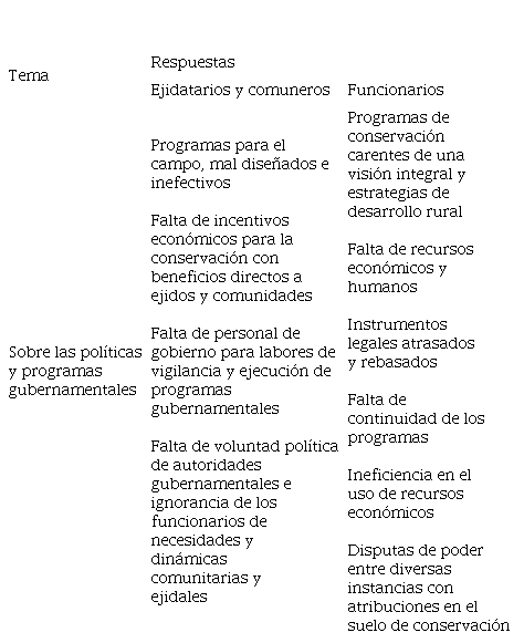 En una primera aproximación, se puede observar que hay coincidencias entre comuneros y funcionarios con respecto a las fallas de la política en la integración de visiones de conservación, desarrollo agrícola y contención de la expansión urbana. Sin embargo hay que señalar que a los propietarios se les hace responsables de frenar la devastación de la superficie boscosa, a la vez que se les restringe el libre uso de los paisajes agrícolas y pecuarios que son de su propiedad, condicionándoles además los apoyos económicos de los programas gubernamentales dirigidos a los proyectos productivos, a los cuales se les atribuye un doble propósito: primero, el mejoramiento de las condiciones de vida de los ejidatarios y comuneros, y segundo, ser parte de una estrategia de mejoramiento de las condiciones ambientales prevalecientes en el SC.