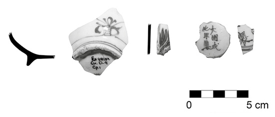 Dentro de la vajilla antes mencionada, se recuperaron dos monogramas o marcas de fabricación de color azul con caracteres chinos en la base de cada una de las vasijas; el primero se halla completo mientras que el segundo es un fragmento de pequeñas dimensiones, por lo que sólo se logra apreciar parte de aquél (Pantone 281 C, 281 U, respectivamente).