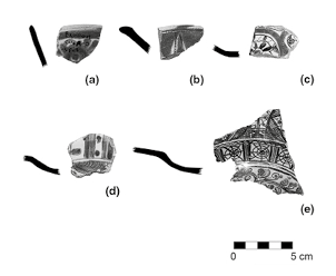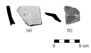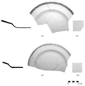 En la base de los platos se recuperaron 20 marcas incisas de fabricación bajo el vidriado de origen europeo y a través de ellas pudimos observar que estos fragmentos provenían de dos fábricas de manufactura. Se identificaron 17 ejemplos de la primera, de procedencia inglesa, un ancla con la palabra “Davenport”7 en la parte superior, marca que, según Patricia Fournier (1990: 112,119), se fabricó a partir de 1815; de la segunda marca sólo se hallaron tres ejemplares que presentan un círculo con tres rayas y puntos, y no fue posible saber su procedencia. Fournier (1990: 115,117) ilustra una marca grabada, semejante a la nuestra, con la clave N 19 y de probable origen inglés. Es curioso observar que la primera marca que consiste en un ancla sólo se encuentra presente en la variedad Borde de Concha color verde, mientras que en el tipo Borde de Concha Azul sobre Blanco se encuentran las dos marcas antes mencionadas.