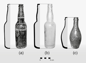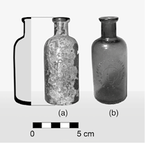 Entre el escaso material de vidrio fue posible recuperar algunos fragmentos e identificar seis objetos de vidrio pertenecientes a contenedores de productos farmacéuticos y bebidas carbonatadas, así como a un tintero, entre otros. Se hallaron tres botellas de vidrio completas, fabricadas con la técnica de soplado en molde. La primera es de color ámbar translúcido (Pantone 470 C), sus dimensiones son de 24.2 cm de altura, el diámetro de la base es de 6 cm, y el interior de la boca, 1.8 cm; ni la base de la botella ni el cuerpo del recipiente presenta algún tipo de letra realzada o leyenda. Probablemente tuvo una etiqueta de papel, perdida a través del tiempo (Figura 11a).