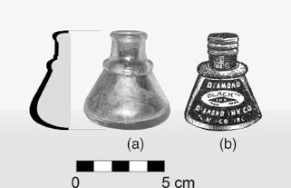 También se recuperó un pequeño frasco de vidrio translúcido9 cuya tapa posiblemente haya sido de corcho, que pertenece a un contenedor de tinta negra; su altura es de 6.5 cm y su diámetro en la base, de 6.3 cm. El cuerpo del envase no ostenta leyenda alusiva al producto ni a la industria, por ello suponemos que tuvo una etiqueta de papel. En el catálogo 104 de Sears Roebuck & Co. de 189710, con el No.53153, se ilustra un frasco que corresponde a ¼ de botella de tinta de color negro con un precio de 0.42 centavos de dólar, marca Diamond Chemical Writing Fluid, similar al recuperado en las excavaciones. Daniel Schávelzon (1991: 69; 2001: 283-284) menciona que estos contenedores originalmente se fabricaron de cerámica gres y eran comunes en el siglo xix e inicios del xx; a partir de 1880, en Argentina, fueron reemplazados por tinteros de porcelana y vidrio.