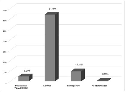 En relación con la cerámica fechada para la Colonia (1550-1800/1850 d.C.), ésta fue la más abundante con un total de 3,196 tiestos, es decir 81.10% de la muestra. Sin embargo, 27 fragmentos no fueron identificados debido al grado de erosión que presentan y a sus pequeñas dimensiones; correspondiéndoles tan sólo un 0.69 por ciento.