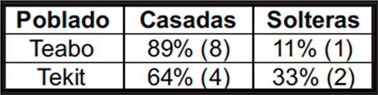 En el cuadro 1 se puede observar que entre las 15 mujeres empresarias entrevistadas había casadas y solteras, en Teabo 89% (8) eran casadas, y 11% (1) solteras. En Tekit se encontró que 64% (4) eran casadas y 33% (2) solteras.