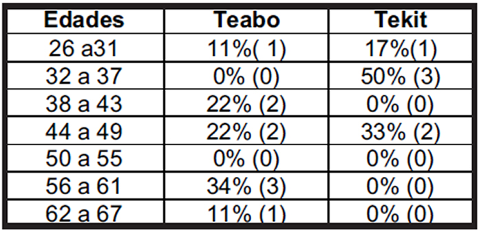 En lo que respecta a edades, se observa en el cuadro 2 que éstas oscilan entre los 26 y 67 años. De los casos que se entrevistaron en Teabo sólo 11% (1) tiene menos de 31 años, y 11% (1) tiene más de 61 años. Algo que se observó en este poblado es que en los rangos entre los 32 a 37 y 50 a 55 años no se encontraron casos para este estudio; en Tekit sí se encontraron casos que tienen entre 32 a 37 años 50% (3) y por lo que se observa en el cuadro 2, todos los casos son menores de 49 años.