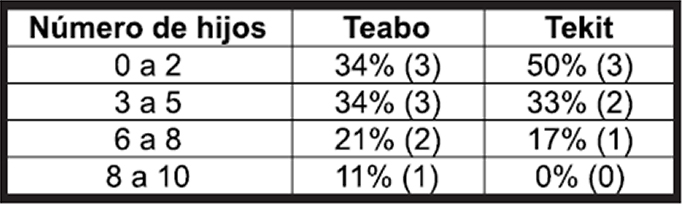 En el cuadro 3 se muestra que en Teabo el mayor número de mujeres tiene entre cero y dos y entre tres y cinco hijos, sin embargo se presentaron casos que tienen entre 6 y 8 hijos, 21% (2) y de 8 a 10, 11% (1). Lo que respecta a Tekit en los casos encontrados se observa que no tienen más de 8 hijos; 83% (5), tiene entre cero y cinco hijos.