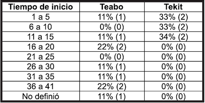 En cuanto al tiempo de inicio, se presenta en el cuadro 4 que existen mujeres que tienen menos de 5 años en esta actividad, en Teabo 11%( 1) y en Tekit 33% (2). En lo que respecta a Teabo, se puede observar que hay casos que tienen más de 36 hasta 41 años dedicadas a este negocio 22% (2), sin embargo en Tekit 33% (2) tiene de 6 a 10 años de inicio y la antigüedad de dedicarse a esta actividad no rebasa los 15 años, 34% (2).