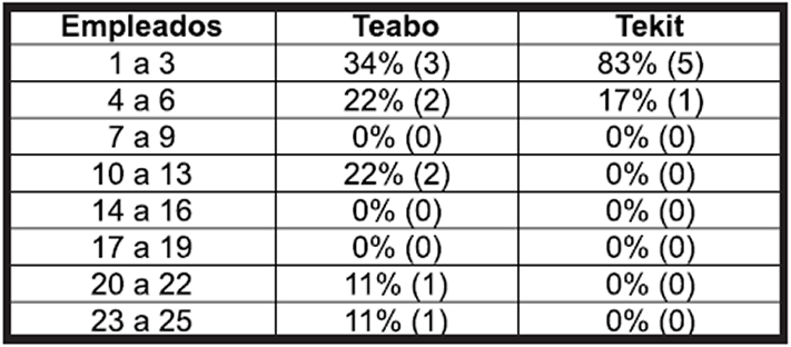 En Teabo, siete de las mujeres empresarias contratan a familiares y sólo dos no lo hacen. En Tekit, cinco de los seis casos contratan a personas que pertenecen a su familia, sólo en un caso los empleados no tenían relación de parentesco con el patrón.