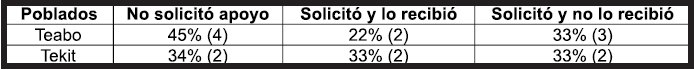 Algunas de las empresarias han solicitado apoyo a instituciones gubernamentales,3 con el fin de tener los medios necesarios para continuar el crecimiento en sus negocios, sin embargo no todas han tenido la misma respuesta favorable, por lo que se observa en el cuadro 6 en Teabo 45% (4) no solicitó apoyo, 22% (2) solicitó y recibió y quienes solicitaron pero no se les proporcionó 33% (3). Es importante mencionar que el apoyo recibido ha sido para darle continuidad a los propios proyectos, no habiendo un vínculo para el crecimiento de estos proyectos, pues la cantidad de apoyo es insuficiente para crecer a largo plazo.