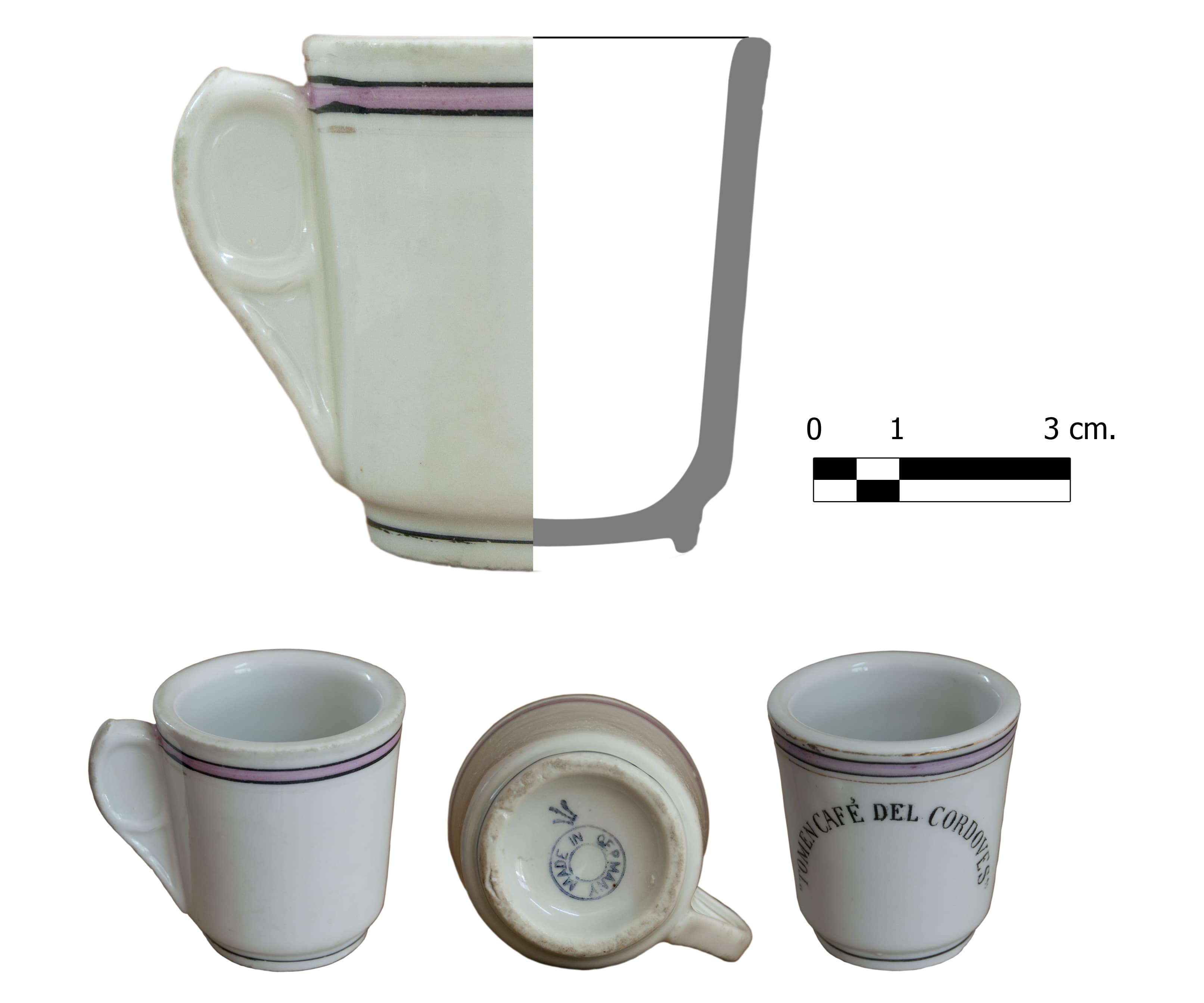 Todas llevaban una leyenda que dice: TOMEN CAFÉ DEL CORDOBÉS,[5] este modelo de tazas se utilizó para el servicio de “grecas” (pequeñas tazas de café) del restaurante.[6] Sus dimensiones son 6.2 cm de alto y 5.7 cm de ancho, con un diámetro en la boca de 4.7 cm y un grosor de 5 mm, no presentan marca de fabricación.[7]