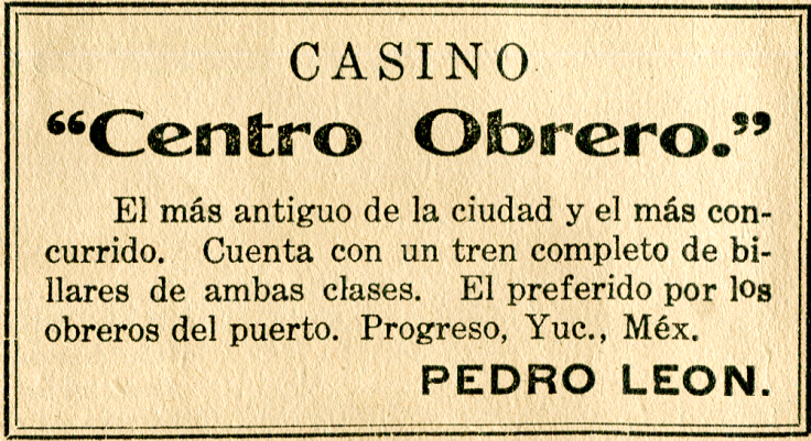 No fue realmente hasta finales de la segunda década del siglo xx, en pleno apogeo del socialismo en el estado, es decir hacia 1918, cuando se instala en el puerto de Progreso, un establecimiento comercial llamado originalmente “Casino Obrero”, que contaba con una cafetería, un salón de billares y cantina. En él se reunían marinos de diferentes nacionalidades que provenían de los diversos vapores que llegaban al puerto, principalmente por el tráfico comercial de la fibra de henequén. La población en general se reunía, no sólo para tomar café y cerveza, sino para divertirse con juegos como el póker, billar, dominó, dados, panguingüe, o para discutir las noticias de los periódicos o leer un buen libro.