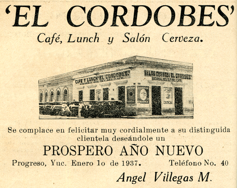 El importante establecimiento denominado “El Cordobes” de la propiedad del Sr. Ángel Villegas que por más de 5 años vino regenteándolo con verdadero éxito, con fecha de hoy ha pasado a poder del estimable comerciante Sr. Miguel Vargas T, por compra que hiciera al Sr. Villegas. El Sr. Vargas ha sido felicitado por la adquisición de este establecimiento, para festejar el suceso ofreció a sus amistades un espléndido lunch-cerveza (Diario de Yucatán, Nuevo propietario, 20 de marzo de 1938, 5).