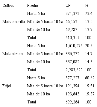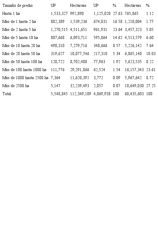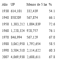 Fuente: INEGI. Censo Agrícola, Ganadero y Forestal 2007Es la unidad de producción que más ha crecido en el país. Las UP menores a 5 hectáreas, en lugar de disminuir en el transcurso del tiempo como se pretendió con muchas políticas agrarias, se han multiplicado, su crecimiento en 80 años fue de 708.7%, al pasar de 332 mil que existían en 1930, a 2.6 millones de unidades en 2007, lo que la convierte en la característica que distingue a los productores de nuestro país (íbid.).