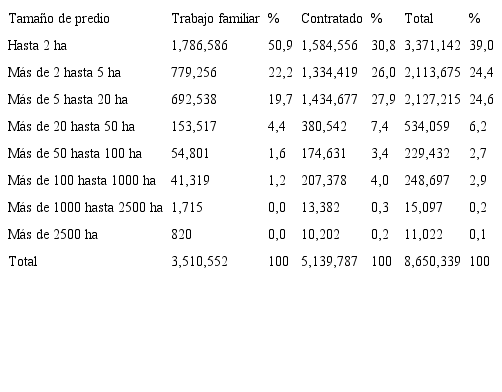 Generan la mayor parte del empleo agropecuario. Las UP menores a 5 hectáreas generan 56.8% de los empleos del sector, tanto familiares como contratados. Si les sumamos las UP hasta 10 hectáreas llegan a 74.1% (íbid.). Es decir, tres de cada cuatro empleos se localizan en la pequeña y mediana agricultura, mientras que en las UP mayores o iguales a 100 ha sólo contratan 7.9% de los trabajadores agrícolas.