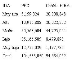 El presupuesto favorece a municipios con mejor Índice de Desarrollo Agropecuario (IDA).[3] En los municipios de Muy Alto Índice de Desarrollo Agropecuario se ejerció 4.7% del presupuesto PEC y 21.3% del crédito FIRA, aun cuando sólo incluyen 0.7% de UP; mientras que en los municipios de IDA Muy Bajo, en los que se encuentra 20% de los productores, se ejerció 12.2% del PEC y sólo 1.2% del crédito otorgado por FIRA. El per cápita por Unidad resultó de 177,067 pesos en municipios de IDA Muy Alto contra 15,691 pesos en los municipios de IDA Muy Bajo. Los municipios con mejor IDA tienen mayores posibilidades de competir contra otros productores y de emprender proyectos de mayor impacto regional.