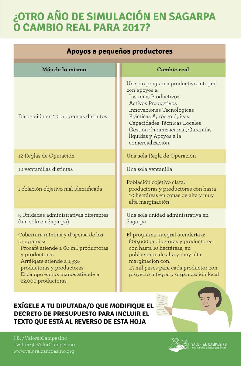 La campaña Valor al Campesino retomó los resultados de la evaluación para solicitar cambios al programa en 2017. Lo presenta de manera resumida en la siguiente infografía: