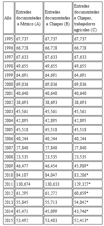 En la década de 1990, las oficinas de la Dirección General de Servicios Migratorios de la Secretaria de Gobernación de México comenzaron a registrar el ingreso de TAcomo un flujo particular y no como un agregado de las estadísticas de visitantes locales. En las estadísticas de mediados de dicha década, ya el INM reportaba los montos de permisos que se expedían para autorizar el ingreso de TA, aunque no es muy claro cómo se llevó a cabo el proceso. Carlos Cáceres, por ejemplo, señalaba que en 1993 no había estadísticas de trabajadores agrícolas (Cáceres, 2001); sin embargo, él elaboró una “Relación de trabajadores” del año 1992, a partir de la información contenida en los listados que usaba el INM para la documentación de jornaleros, lo que hace pensar en problemas relacionados con la organización y sistematización de las estadísticas migratorias, más que en la falta de las mismas.