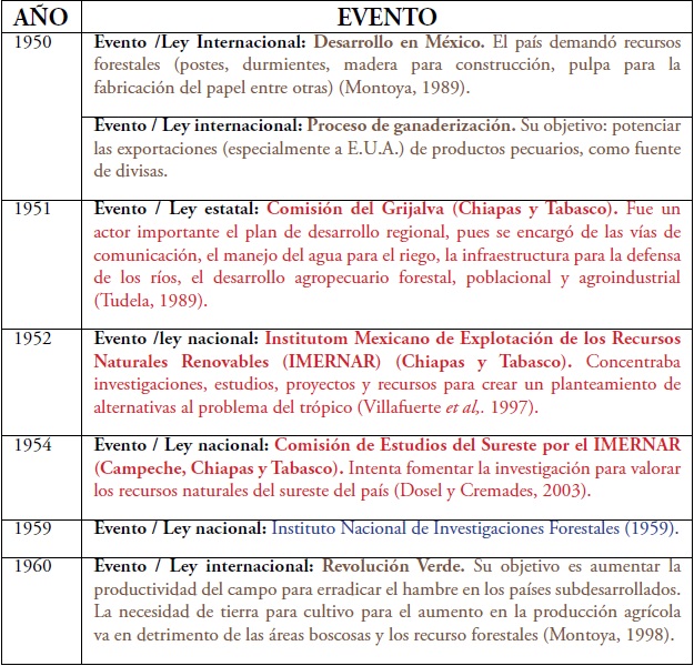 Referente a Tabasco, en la década de los cincuenta existió la Secretaría de Agricultura y Ganadería y Economía, la cual otorgaba permisos para explotar los recursos naturales, además de otorgar apoyos técnicos y monetarios; de esta secretaría dependían la Agencia de Agricultura y la Agencia General de Agricultura. Para la siguiente década, se menciona la creación de la Comisión Forestal del Estado de Tabasco y el Grupo Cívico Forestal en el municipio de Teapa, que surgen a iniciativa de los gobiernos estatal y federal, con la finalidad de mejorar las prácticas de extracción y concientizar sobre el cuidado de la masa forestal. En la década de los setenta, a la Agencia de Agricultura se le agregó también la de Ganadería, contradictoriamente, apoyaba los programas de reforestación donando árboles y, a su vez, otorgaba permisos para la explotación de la ganadería.