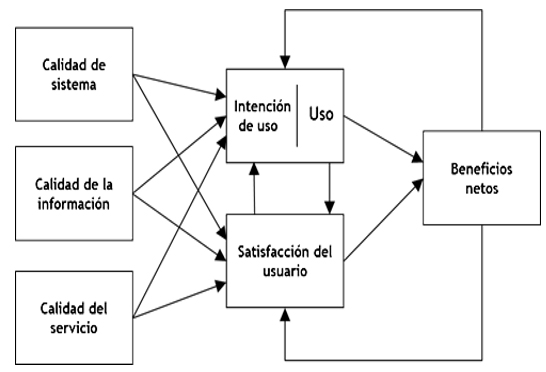 El modelo de D y M se modificó en el año de 2003, debido a las numerosas atenciones que tuvo por parte de los investigadores, entre los principales cambios que sufrió, fue que se aceptó la recomendación de Pitt et al. (1995) de incluir la calidad del servicio como constructo del modelo, evaluada principalmente por medio de SERVQUAL y de su principal crítico Seddon (1997) de reemplazar las variables impacto individual e impacto organizacional, por la variable beneficios netos (DeLone y McLean, 2003). Esta revisión permite al modelo aplicarse a cualquier nivel de análisis que el investigador considere más relevante (Petter et al., 2008). La figura 1 muestra el resultado de la actualización.