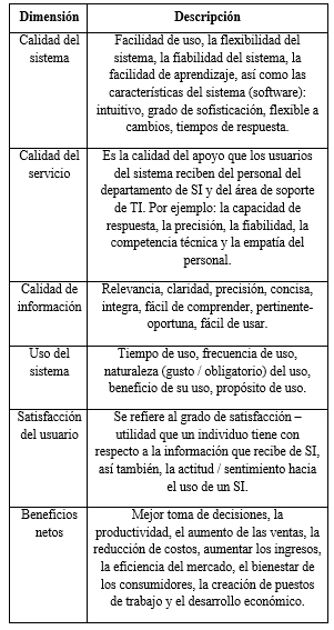Las dimensiones utilizadas son calidad del sistema, calidad de la información, utilidad percibida, satisfacción del usuario, beneficios: individuales, organizacionales, sociedad, mientras que para la parte conductual las variables de expectativa y uso del SI. Una crítica a este modelo es el hecho de contener una red compleja de elementos para la evaluación (Medina, 2005).