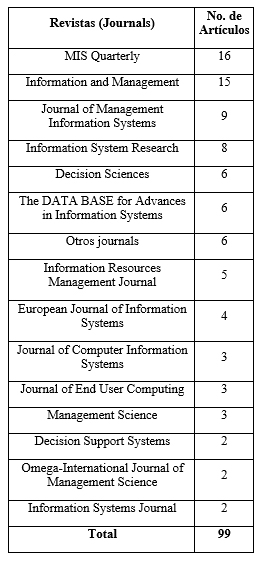 Cabe mencionar que durante la revisión de la literatura se localizaron más estudios, la Tabla 2 muestra un resumen de las frecuencias en las cuales el modelo original de D Y M de 1992 ha sido citado, estos artículos fueron publicados en revistas prominentes y la cual proporciona una muestra de la importancia que ha tenido este modelo de medición del éxito de los SI.