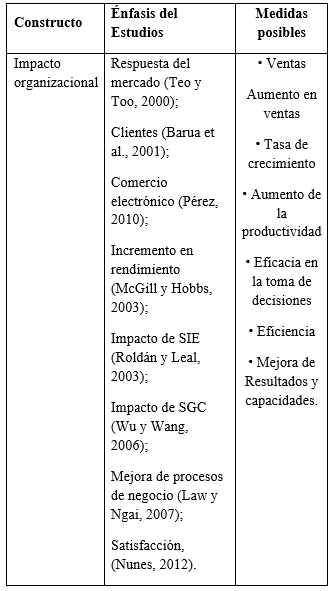 En la literatura, se encuentran una diversidad de estudios internacionales sobre la percepción del éxito en los SI con respecto a sus beneficios ofrecidos tanto a nivel individual como organizacional (DeLone y McLean, 2003; Sabherwa et al., 2006; Petter et al., 2008), detectándose que las dimensiones de la calidad de los SI tienen una influencia positiva y significativa en lo organizativo ya sea de forma directa o indirecta (Gorla et al., 2010); esto se confirma con los resultados obtenidos por Petter et al. (2008), en donde se señala que de un total de 26 investigaciones empíricas realizadas entre 1992 y 2007 con un análisis a nivel organizacional, un 87% tuvieron resultados positivos y significativos, pero según los autores no existe suficiente evidencia empírica para evaluar la mayoría de las relaciones a nivel organizacional.