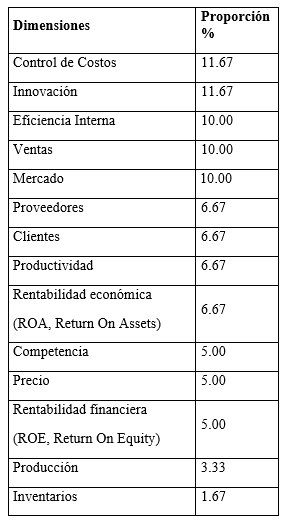 El análisis de contenido proporcionó los siguientes resultados: La innovación en productos / servicios y control de costos, de acuerdo con diversos autores (contenidos en la Tabla 4) representan las categorías que en mayor medida son utilizada para evaluar el impacto de SI en el desempeño organizacional. De igual forma, los factores de la eficiencia interna, mercado y crecimiento en ventas son también categorías que se encuentran presentes con un 10% respectivamente cada uno en el estudio del desempeño organizacional. La Tabla 4 muestra la proporción de frecuencias encontradas.
