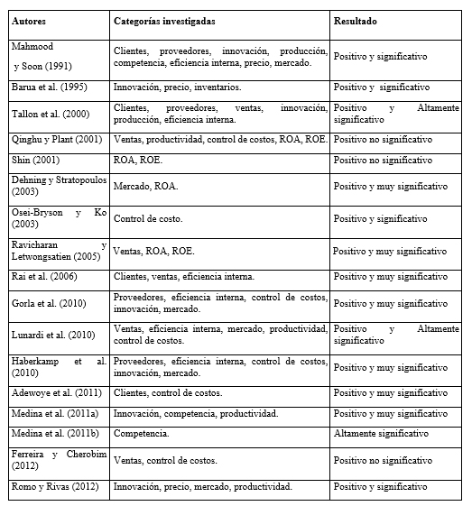 La categoría clientes por su parte se relacionó de manera positiva y significativa, mientras que los estudios analizados muestran que las TI y los aspectos financieros, se asociaron de manera inversa, lo cual coincide con la literatura en el sentido de que es difícil y complejo medirlo, y que las técnicas financieras y los conductos cuantitativos no suficientes para tal análisis (Albertin y de Moura, 2008), además de la posible falta de participación por parte de las empresas para proporcionar información de este tipo (Ferreira y Cherobim, 2012).