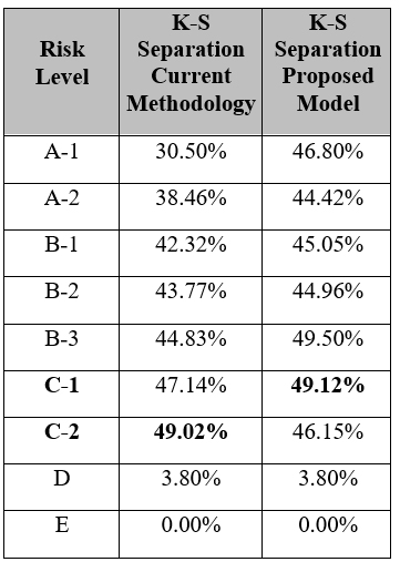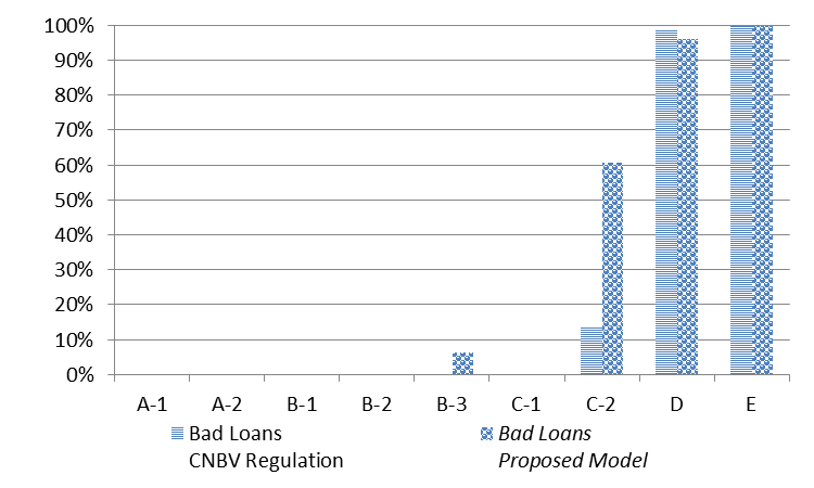 Therefore, it is shown with the proposed model the detection of bad loans is greater than the current model used by the CNBV, ensuring better and greater discrimination of bad or defaulting loans, as shown notably the B-3 and C-2 risk levels. While risk groups D and E, maintain their discriminatory trend between the two models.