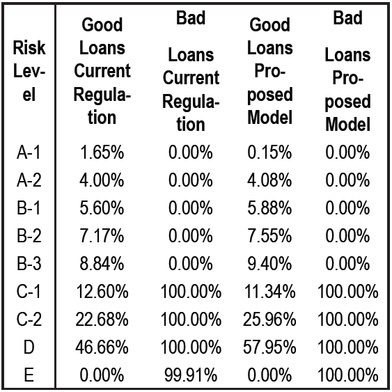 Therefore, it is shown with the proposed model the detection of bad loans is greater than the current model used by the CNBV, ensuring better and greater discrimination of loans. Table 2 shows the discrimination power among the risk levels by the percentage of loan loss provisions (PDC * SP) is greater in C-1 (49.12%) with the proposed model, which allows to the SOFOMERS sector in Mexico the ability to identify better the good and bad loans, applying more effective collection policies to improve that risk level.
