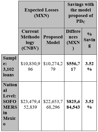 In order to obtain the Expected Losses (EL=PD* LGD*EaD) in credit risk management, in this research was considered the current regulation (CNBV) and the results obtained with the data information of 3,102 sample in revolving loans managed by SOFOMERS; as well as the particular estimation of expected losses with the proposed model (PDC) in this research. See Table 3.