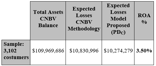 In Table 3, the amount of EL obtained with the sample of 3,102 in revolving loans, according to the proposed model (PDc), it was MXN $ 10.3 million versus the current methodology of MXN $ 10.8 million. So, the Mexican SOFOMERS sector could have had savings of MXN $ 556,700 (3.52%) at the end of June 2014. If this trend would have continued as at the system, the savings would have been MXN $ 825.7 million. This implies to analyze the effect of ROA at the end of June 2014, which was a 3.50% of return in the Mexican SOFOMERS sector.