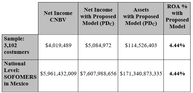 It was also validated that the savings would increase the assets accounting in SOFOMERS sector by MXN $171,340.9 MM (versus MXN $ 170,515.2 MM by CNBV methodology), and it would increase net income to MXN $7607.9 MM (versus MXN $5961.4 MM by CNBV methodology), according to the data obtained at the end of June 2014. Thus, the ROA of 3.50% obtained with the PD of CNBV methodology would have pass to 4.44% with the proposed model (PDC).