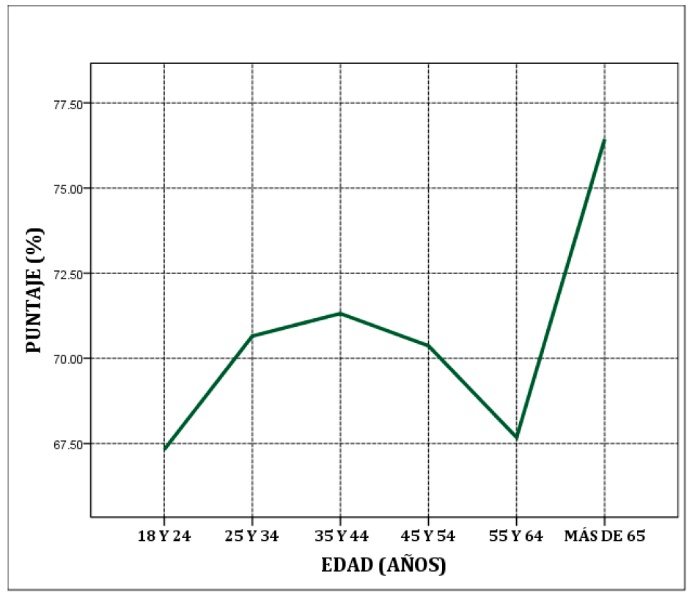 En la figura 3, se observa que el valor percibido va en aumento entre las edades de 18 a 44 años, logrando un máximo relativo de percepción del coste, entre las edades de 35 a 44 años (71.3). En las edades mayores a 65 años se presenta la máxima percepción absoluta del coste (76.4) para este grupo de turistas.