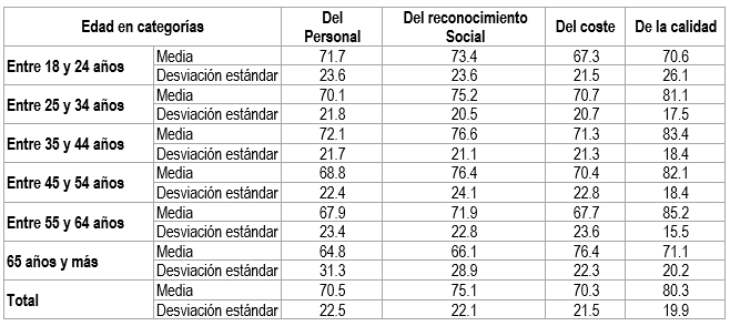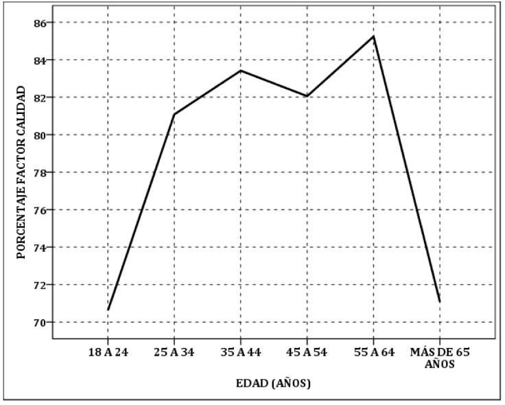 En la figura 4, se refleja que el valor promedio del valor percibido de la calidad es mayor entre las edades de 25 a 64 años. El promedio varía entre 81 y 85%, mientras que en las edades de 18 a 24 años y más de 65 años el promedio es menor y alrededor de 71% de valor percibido de la calidad.