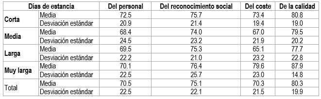 Los días de estancia se encuentran mayormente representados por la denominada estancia Media, es decir de cuatro a cinco días con el 46.4% y minoritariamente la nombrada Muy larga, con sólo el 5.6%. (Véase la tabla 1).