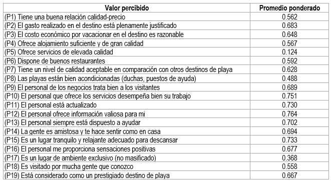 También se puede observar en la escala inicial del valor percibido el promedio ponderado, obtenido con el análisis factorial, que indica cuales son los atributos más valorados. Se destacan como principales fortalezas del valor percibido: “El personal ofrece información valiosa para mí” (.764), “El personal que ofrece los servicios desempeña bien su trabajo” (.751), “Es un lugar tranquilo y relajante adecuado para descansar” (.733) y “El personal siempre está dispuesto a ayudar” (.702). Por la parte de los atributos menos valorados se encontró que: “Ofrece servicios de elevada calidad” (.124), “Es un lugar de ambiente exclusivo (no masificado)” (.368) y “Las playas están bien acondicionadas (duchas, puestos de ayuda)” (.488). (Véase la tabla 2).