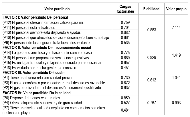Antes del contraste de las hipótesis se procedió al análisis de dimensionalidad, fiabilidad y validez. Las escalas utilizadas cumplen la validez de contenido, en la medida en que se tuvieron en cuenta todos los aspectos considerados en la literatura para medir el valor percibido de un destino turístico, además de que se depuraron los ítems durante el proceso de consulta. Para la primera sección del cuestionario se realizó un análisis factorial confirmatorio usando factorización de eje principal, el cual determinó que las variables se agrupaban en cuatro factores.