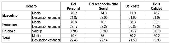 Existen diferencias significativas en los promedios de valor percibido entre hombres y mujeres para los factores del coste y de la calidad; mientras que no hay diferencias significativas para los factores del personal y del reconocimiento social.