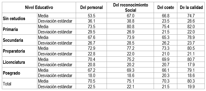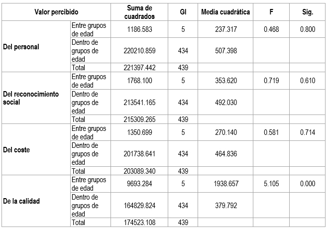 Los resultados obtenidos en la contrastación de las hipótesis H1c1, H1c2, H1c3, H1c4: no permiten afirmar que exista una relación entre el nivel educativo y el valor percibido, ya que los promedios del puntaje de valor percibido de los factores, para cada nivel educativo tienen un rango pequeño de variación que hace sospechar que no existe mucha relación entre el valor percibido y el nivel educativo. También en el análisis del ANOVA se puede ver que los valores del nivel de significancia no son muy bajos como para evidenciar que existan diferencias significativas o variación de las medias del valor percibido entre los niveles educativos (Véase tabla 7).
