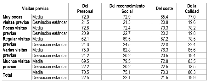 Las visitas previas al destino pueden influir en la valoración percibida en todos los factores analizados. En el caso del factor de la calidad, existe una relación positiva o creciente con la frecuencia de visitas previas. Mientras más visitas previas tengan los turistas a Acapulco, mayor es la valoración percibida de la calidad, por lo que se tendrá que poner más atención en Acapulco para considerar los niveles de calidad de los servicios que ofrece. De ahí que las visitas previas podrían considerarse un elemento susceptible de utilizarse en la segmentación de los turistas.