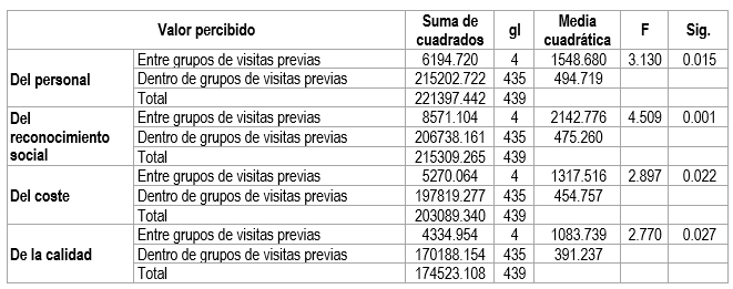En los cuatro factores se presenta un nivel de significancia por debajo de 0.03, lo cual muestra que existe una fuerte relación entre el valor percibido de los turistas y las visitas previas al destino turístico. Por lo que se aceptan las cuatro hipótesis de investigación H1d1, H1d2, H1d3, y H1d4.
