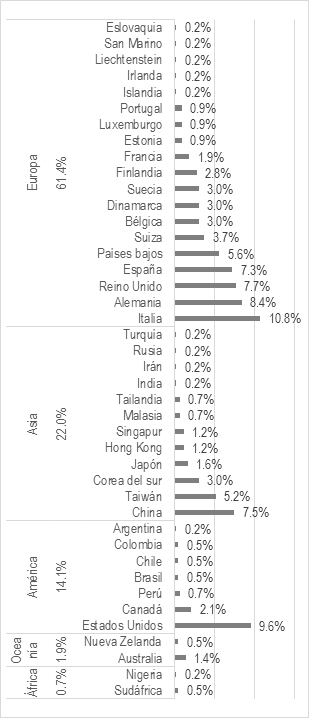 De la Gráfica anterior, se puede apreciar que el continente Europeo cuenta con el 61.4% de los estudios, después Asia con el 22% y América con el 14.1%; y en menores porcentajes se encuentra Oceanía y África. Los países líderes en cada continente son Italia con el 10.8%, China con el 7.5%, Estados Unidos con el 9.6%, Australia con el 1.4% y Sudáfrica con el 0.5%. Por su parte, en América, las economías desarrolladas como Estados Unidos y Canadá conforman el 83% de los estudios, y las economías emergentes y en vías de desarrollo suman el 17% de los estudios. Por lo anterior, los estudios de innovación abierta y rendimiento empresarial de economías en vías de desarrollo y economías emergentes en América ha sido un tema muy poco explorado.