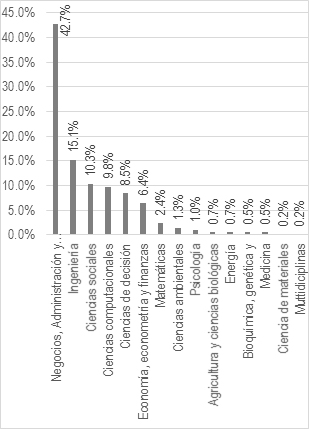 De la Gráfica anterior, se puede observar que la naturaleza del tema ocurre un 42% en el área de Negocios, administración y contabilidad, áreas afines a la anterior son las ciencias sociales que cuentan con un 10.3 %, las ciencias de decisión con un 8.5% y la economía con un 6.4%.Sin embargo, otras áreas donde se estudia el tema en menor medida son la ingeniería con un 15.1% y las ciencias computacionales con un 9.8%.