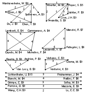De la Gráfica anterior, cada figura obedece a un grupo de investigadores relacionados por las intersecciones, cada apellido y nombre de autor esta seguido de las veces que ha sido referenciado en el análisis con un signo de pesos ($), y el número entre los vértices significa las veces en que se han citado los autores por otros autores en esos documentos relacionados a cada extremidad de los vértices.